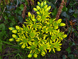 Plants in the crassulaceae, or stonecrop family are succulents, with fleshy, undivided leaves, often very small, and five-petalled flowers, containing five or ten stamens and five carpels. Most flowers are star-shaped, with unfused petals, but in one UK species (pennywort) the corolla is cylindrical. There are about 16 crassulaceae species in the British Isles, including a few garden escapes.