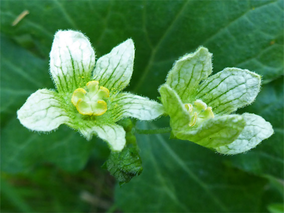 White to pale green, up to 18 mm in diameter, with five hairy, veined petals. Flowers are either male, with five stamens, or female, with three stigmas; they form at the leaf nodes, and are rather inconspicuous compared with the abundant foliage
