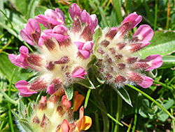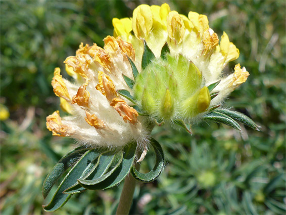 Rounded clusters, up to 4 cm in diameter, often paired (the two sometimes developing at different rates), subtended by hairy, leaf-like bracts. Calyx tubes, coloured white to red, are inflated, and densely covered with silky hairs. The yellow petals (sometimes pink in coastal areas) are crossed by reddish veins at the base. Flowers wither to red and purple