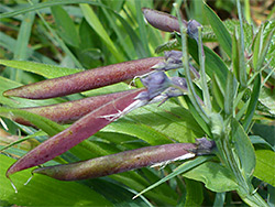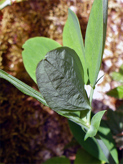Hairless, pinnately divided into two, three or four pairs of broad, lanceolate leaflets, these up to 4 cm long, dark green above, paler below. Leaflets have a midvein and a pair of side veins. No tendrils. Stems are winged