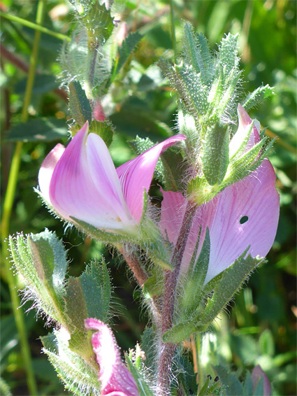 Produced singly at the leaf nodes along the upper half of the stem, which is evenly and densely covered with long hairs, and is usually spineless. Flowers are up to 15 mm long, with similar-length keel and wing petals, and a larger banner petal, and they are attached by short stalks. Calyces are hairy, and deeply lobed