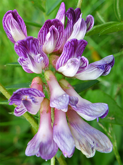 Around 15 mm long; a tubular corolla, with pinkish-white tube, and pale purple petals crossed by darker coloured veins, especially the banner petal, which is only slightly recurved, by at most 45 degrees. The calyx is reddish, sparsely hairy, with five narrow teeth. Flowers form in tightly-packed vertical clusters of up to 20, atop relatively long stalks