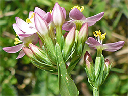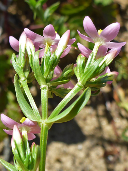 In terminal, forked clusters, with all branches similar in length. Flowers have a green calyx with narrow, linear lobes, and a tubular corolla more than twice as long, opening to five pink (occasionally all-white), spreading, ovate lobes. Flowers are up to 12 mm in diameter, attached by very short stalks, often appearing stalkless