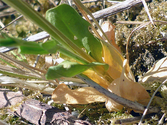 Basal leaves are obovate, in a rosette, while the stem leaves are narrower, though not linear. All are hairless. Leaves have a midvein and one, two or three pairs of side veins
