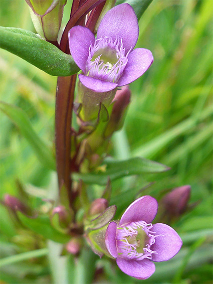 The corolla is tubular, purplish, up to 20 mm long, with four or five triangular lobes, and a ring of short white hairs around the top of the throat. The calyx, more than half the height of the corolla tube, is divided to about half its length into five equally sized lobes, Stems are hairless, and square in cross-section
