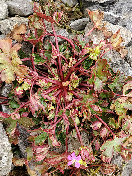 Shiny, bright green, often reddish along the margins; hairless or nearly so. Partially divided (to less than half the way to the base) into five or seven lobes, which are very shallowly divided. Attached by long, reddish stalks