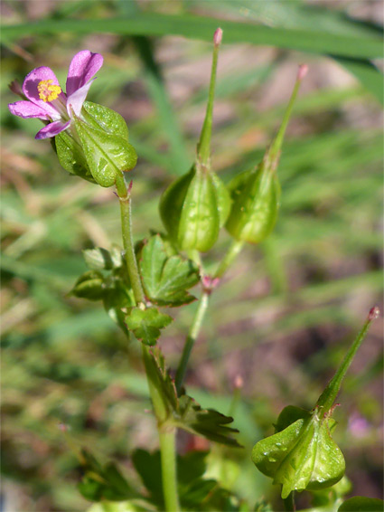 Five small pink, unnotched petals, ten stamens with white filaments and yellow anthers, and a hairless, light green calyx, ribbed and inflated towards the base, divided into pointed lobes towards the tip