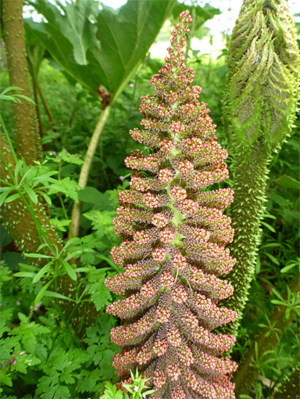 The common name of gunnera manicata, giant rhubarb, refers to the appearance of its leaves, though the plant is not related to the actual rhubarbs, which are from the rheum genus, in the polygonaceae family.