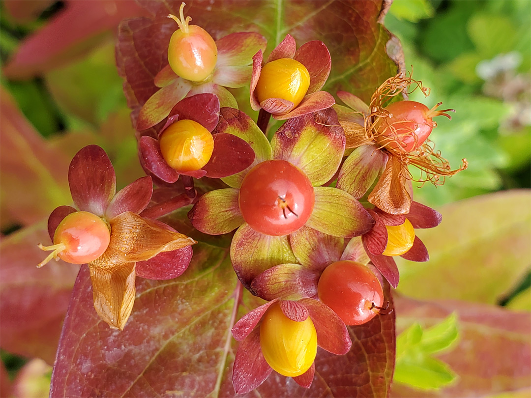 Withering flowers - tutsan (hypercium androsaemum), Lavernock Nature Reserve, Cardiff