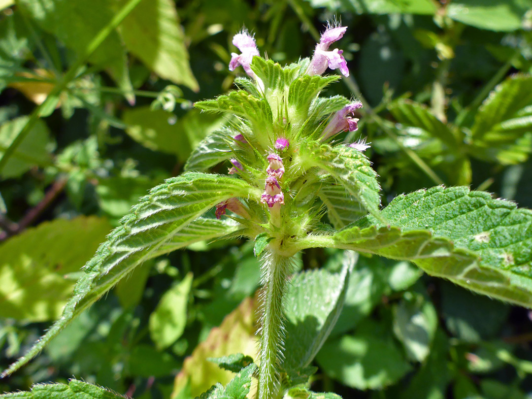 Top of a flowering stem - common hempnettle (galeopsis tetrahit), The Rough, Devon