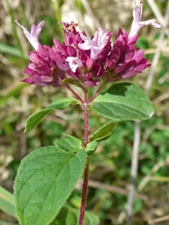 Opposite, ovate, untoothed, hairy underneath, up to 45 mm long. Lower stem leaves may have one or two pairs of smaller leaflets at the base
