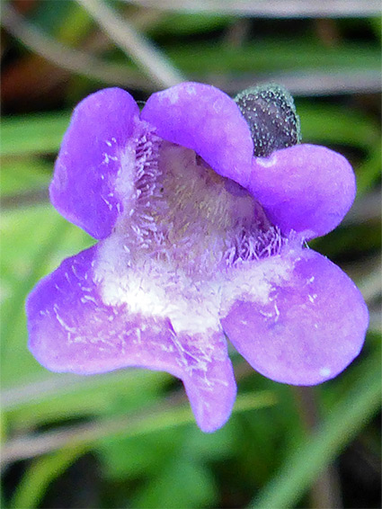Solitary, atop glandular hairy stems, curved towards the tip. The two-lipped corolla, up to 15 mm long, is dark purple with a long, straight, backwards-projecting spur. The inside, especially the white throat, is covered with sticky white hairs.