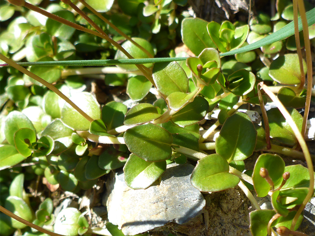 Hairless leaves and stems - epilobium brunnescens (New Zealand willowherb), Nant Irfon National Nature Reserve, Powys