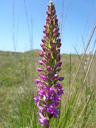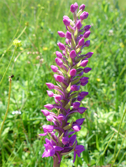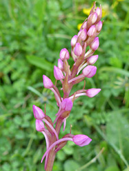 Flowers are uniformly coloured - usually pink, occasionally all-white - without any darker markings; they have three sepals, two at either side, spreading but angled slightly downwards, with rolled-under edges, and one, broader, in the middle, forming a hood with the two upper petals. The lower petal, the lip, is divided into three lobes approximately equal in size. The petal spur is relatively thin, and long, up to 20 mm. Bracts are similar in length to the flowers. Flowers are produced in an elongated cluster occupying up to 15 cm of the stem