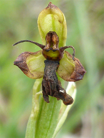 Three green sepals, 90 degrees apart, two tiny, narrow, red-brown upper petals, angled upwards, and a complex, vaguely insect-like lower petal, also mostly reddish-brown, with a silvery-blue patch towards the centre. The lower petal has two downwards-pointing side lobes, and a deeply notched middle lobe. Flowers form in a vertical spike of up to ten heads, relatively well-separated