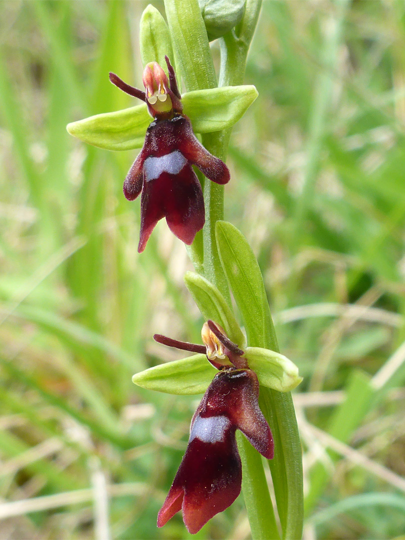 Two red flowers - ophrys insectifera (fly orchid), Selsley Common, Gloucestershire