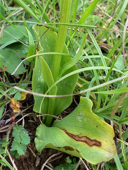 Narrow, alternate stem leaves and a pair of much larger, broad, ovate leaves at the base; up to 8 cm long