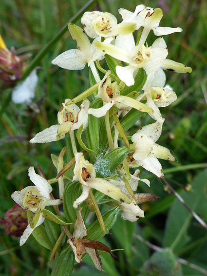Two lateral sepals, angled slightly downwards, and a cupped upper sepal, enclosing the two upper petals. The lower petal is narrow, projecting downwards, similar in length to the lateral sepals (around 10 mm), and extending back to form a long (up to 30 mm), narrow spur. Between the upper petals are a pair of pollen sacs, which are parallel rather than V-shaped. All sepals and petals are white or very pale green