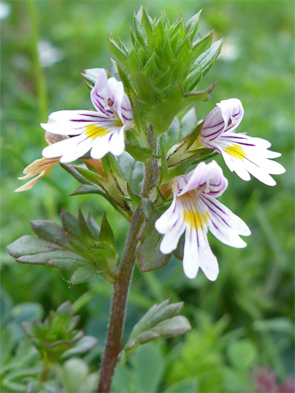 The corolla is white, with two-lips; the upper shallowly divided into two lobes, the lower more deeply divided into three lobes, these also lobed, more shallowly. Lobes are crossed with parallel purple veins, and the mid lobe of the lower lip has a yellow patch at the centre. The calyx is bell-shaped, divided around half its length into four equally-sized lobes. Flowers are generally small, in the range 5 mm to 10 mm