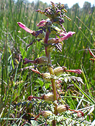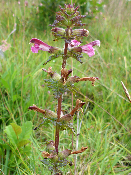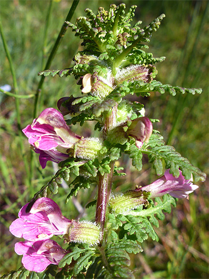 The corolla, up to 25 mm long, is tubular, with a dark pink upper lip, arched towards the tip and flattened at the sides, and a lighter-coloured lower lip, divided near the tip into three spreading lobes. The calyx is greenish, red towards the tip, ribbed and sparsely hairy. Flowers are subtended by leaf-like bracts