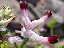 About 10 mm long, pale pink, dark purple at the tip; an upper and two inner petals, similar in length, and a narrow, approximately linear lower petal that projects beyond the other three. At the base are a pair of white, ovate sepals, about a third as long, lined by weak teeth. Flowers form in loose, elongated clusters of around 15 heads, attached by green stalks, each subtended by a bract about 2/3 as long