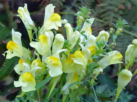 Up to 25 mm long; a tubular, long-spurred, pale yellow corolla opening to two upwards-pointing lobes at the top, and three overlapping lobes below, with a raised, hairy, orange patch in the middle. Sepals are narrow, green and pointed. Flowers form a dense, slightly elongated cluster at the top of the leafy stem