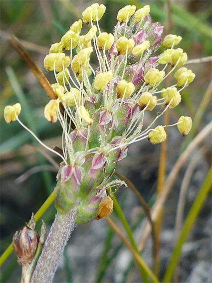 Tiny, with inconspicuous, brownish corollas and long stamens, which have yellow-white anthers atop slender white filaments. Styles are long and feathery. Flowers are subtended by pointed bracts. The inflorescence is a compact cluster, extending no more than 4 cm at the top of the leafless, hairy stalk