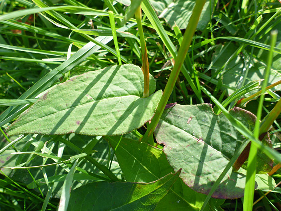 Alternate, ovate, clasping, hairless on top, downy underneath, on hairless stems which are sheathed above the attachment point