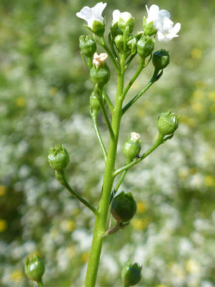 Hairless, light green, obovate, untoothed, on short stalks; in a basal rosette and at widely-separated intervals along the stem