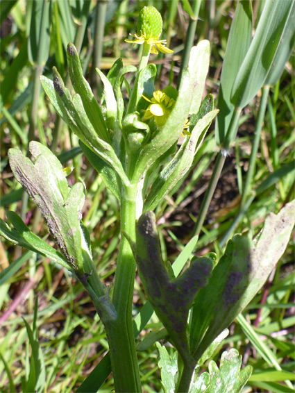 Hairless, divided into three rounded lobes, which, for leaves towards the base, are themselves lobed, and attached by relatively long stalks