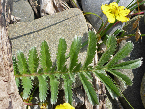 Pinnately divided; a terminal leaflet and up to 12 pairs of lateral leaflets, all lined with large teeth, and covered with downy hairs, sparse above, dense below, giving the surface a silvery appearance. A few smaller leaflets grow between the smaller ones