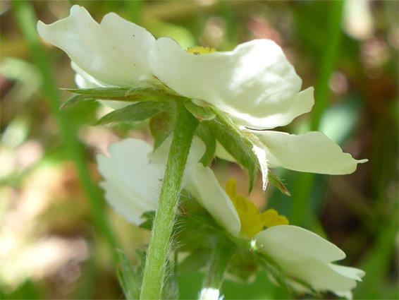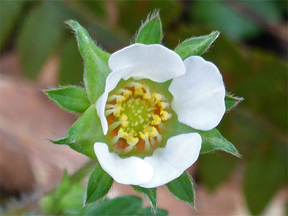 Five white, well-separated petals, around 7 mm long, and five hairy triangular sepals only slightly shorter, visible from above between the petals.