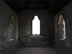 The chapel's location is indicated by signs in the village; a short distance along Chisbury Lane to the east, then 900 feet southwest up a narrow track, parking beside the building, at the edge of the farm precinct. The chapel measures 58 by 26 feet in size, and its walls are formed mostly of flint pebbles, with sandstone used for the door and window frames, plus some red bricks from a later period. Inside, the faded remains of a red medieval consecration cross can be seen, plus lines in the partly plastered walls that mark position of the (wooden) rood screen that once separated the nave (at the west end) from the chancel. The original, arched doorway to the chapel is in the north wall, though access now is through a more recent entrance to the south.